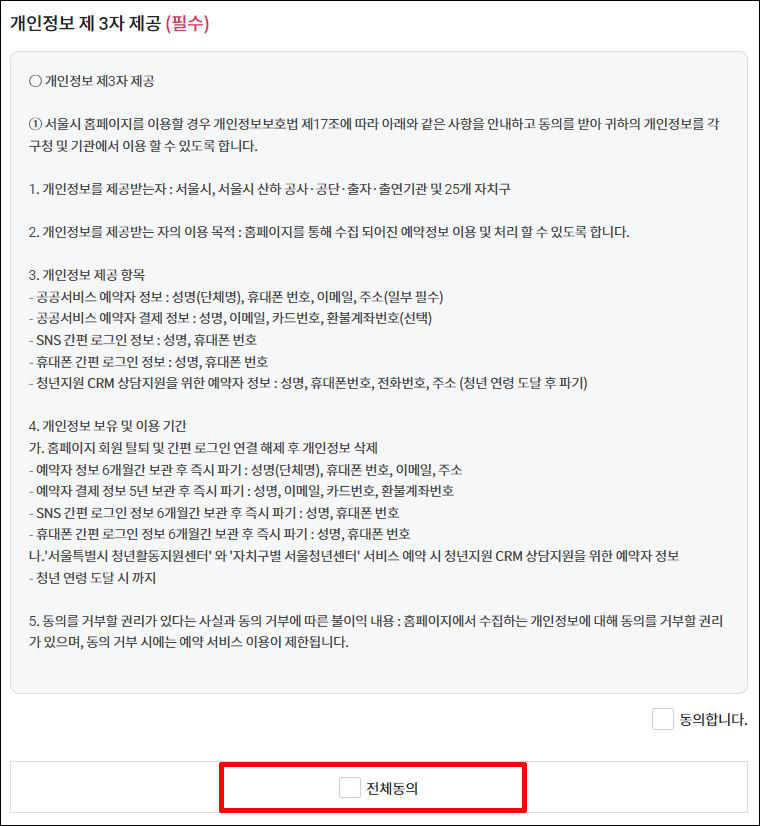 ⑥ 하단으로 스크롤을 하면 동의 절차에서 <전체 동의>를 클릭해주세요