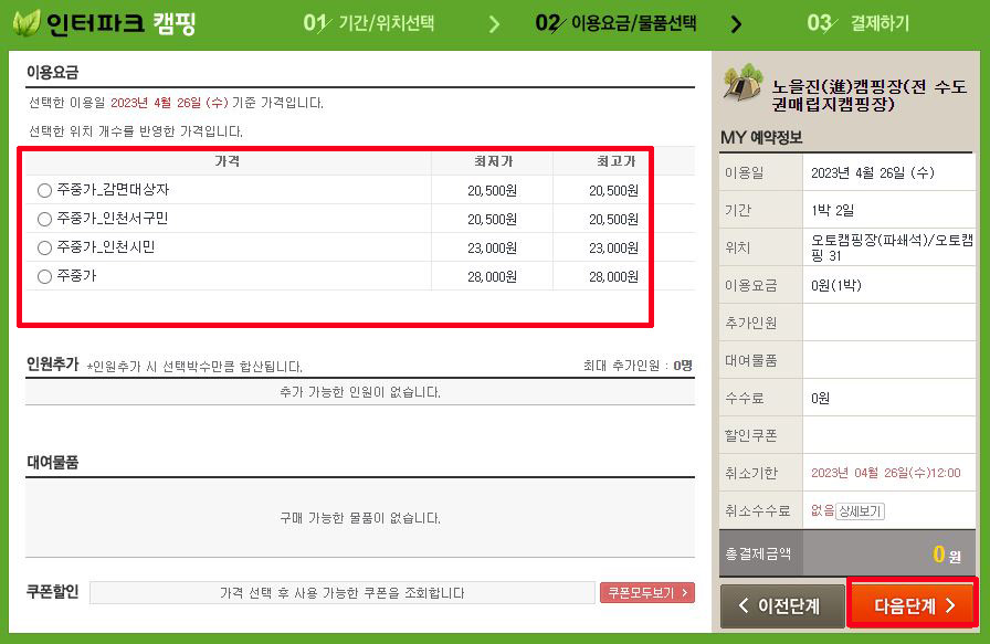 ④ 우측의 비어있는 캠핑장을 선택 → 다음 단계