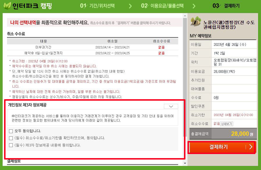 ⑦ 취소 수수료 정보 확인 → 개인정보 제공 <모두 동의> 선택 → 결제하기 → 예약 완료