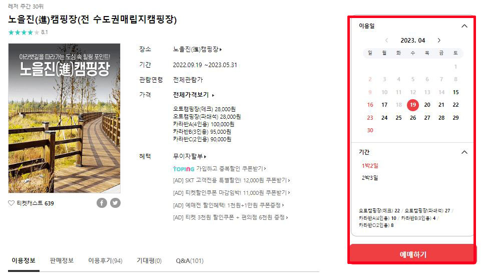 ※ 아래의 캠핑 예매를 통해 예약페이지로 이동이 가능하니 서두르시길 바랍니다.