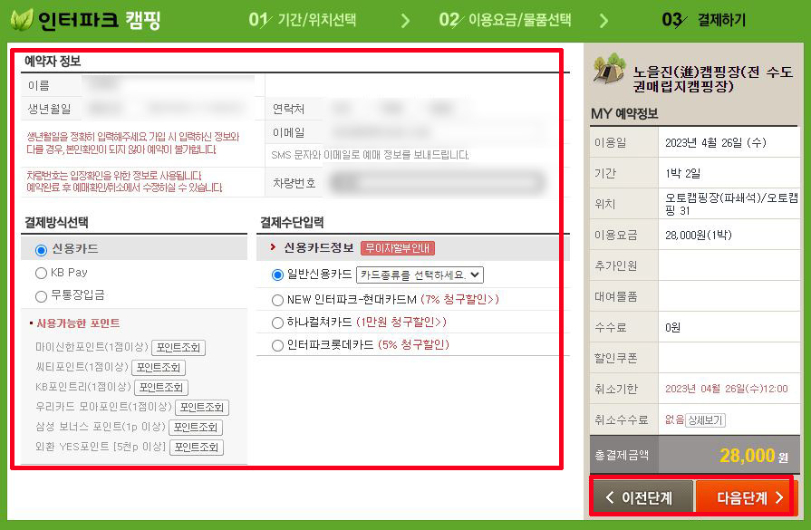 ⑥ 예약자 정보를 정확하게 기입 → 차량번호 기입(추후 변경 불가) → 결제방식 선택 → 결제수단 입력 → 다음단계