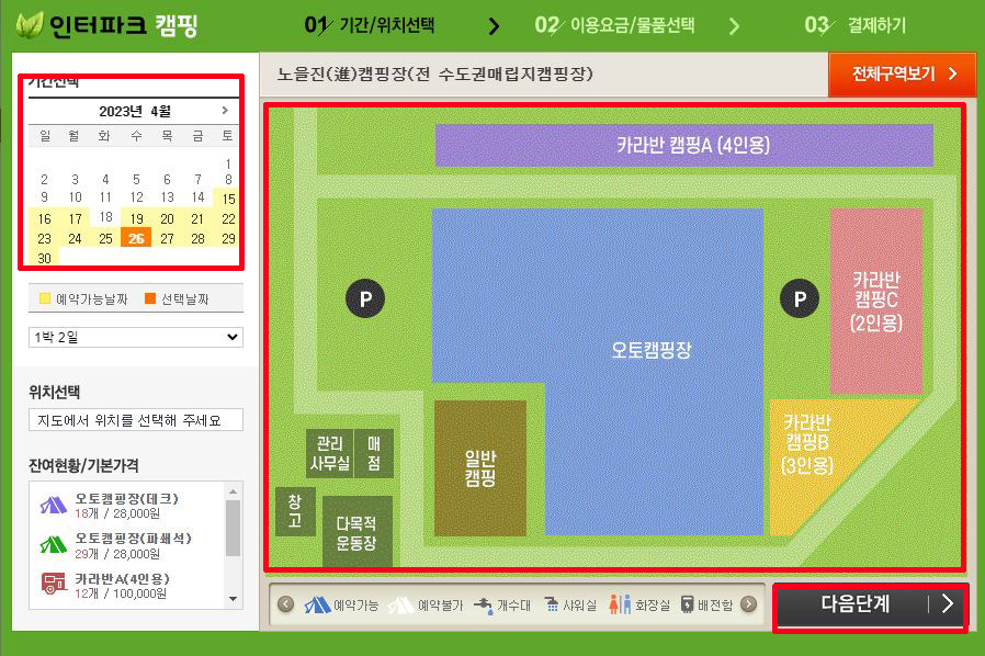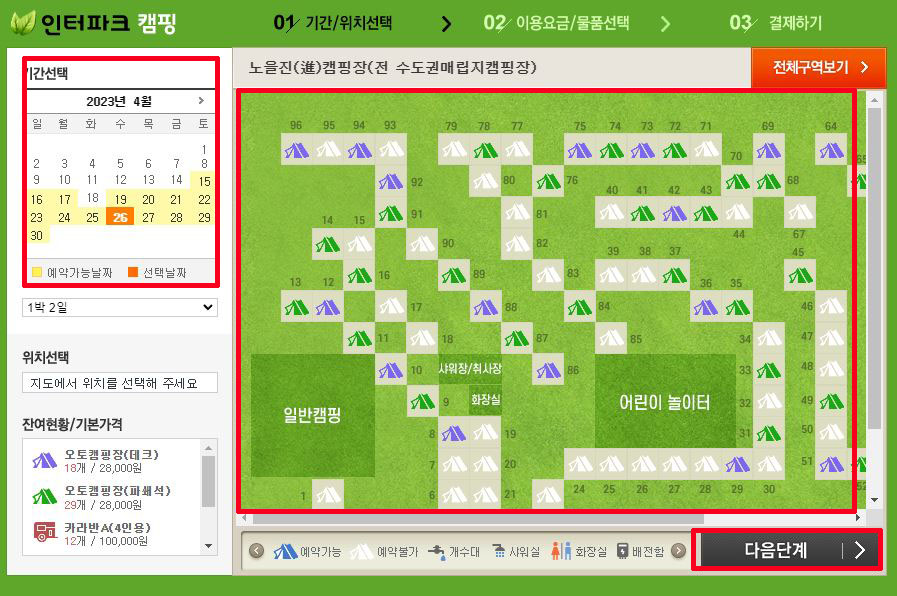 ③ 원하시는 날짜 선택 → 우측의 캠핑장 맵에서 원하시는 캠핑종류 선택 → 다음단계 클릭
