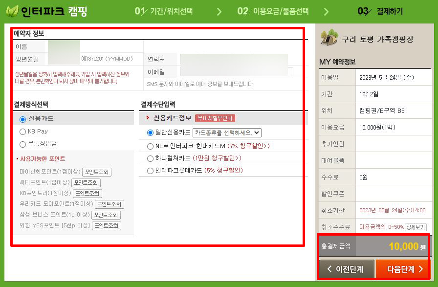 ⑤ 예약자 정보 (생년월일, 이름) 확인 및 연락처와 이메일 기입 후, 결제방식과 결제수단을 입력 후 진행