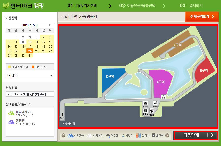 ③ 우측의 캠핑지도에서 원하시는 구역을 선택 후 <다음 단계>를 클릭