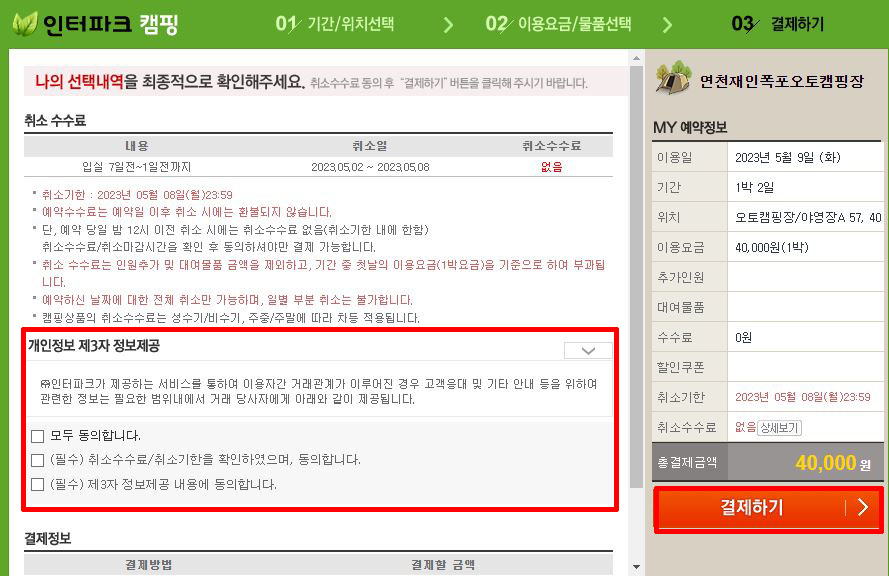 ⑦ 하단의 개인정보 체크 → 결제하기 → 예매 완료