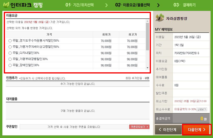 ⑤ 이용요금 선택 → 다음단계 이동
