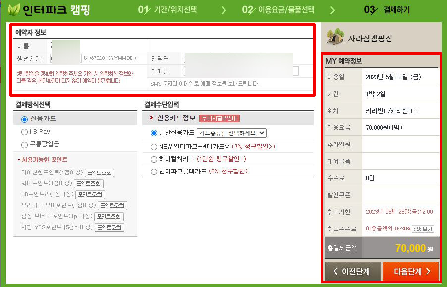 ⑥ 예약자 정보 기입 및 수정 → 결제방식 선택 → 결제수단 입력 → 다음 단계
