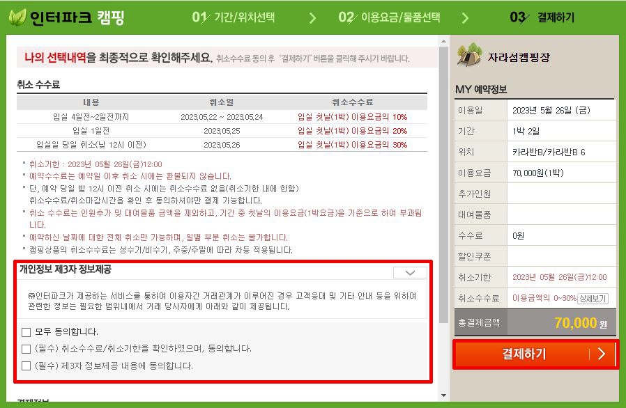 ⑦ 개인정보 모두 동의 체크 → 결제하기 → 예매완료