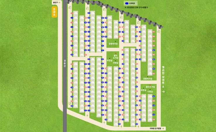 오토캠핑장 사이트는 전기 사용이 불가하고 사이트 간 간격이 좁기 때문에 가장 오토 캠핑장의 가장 가장자리를 이용하시는 것을 추천한다.