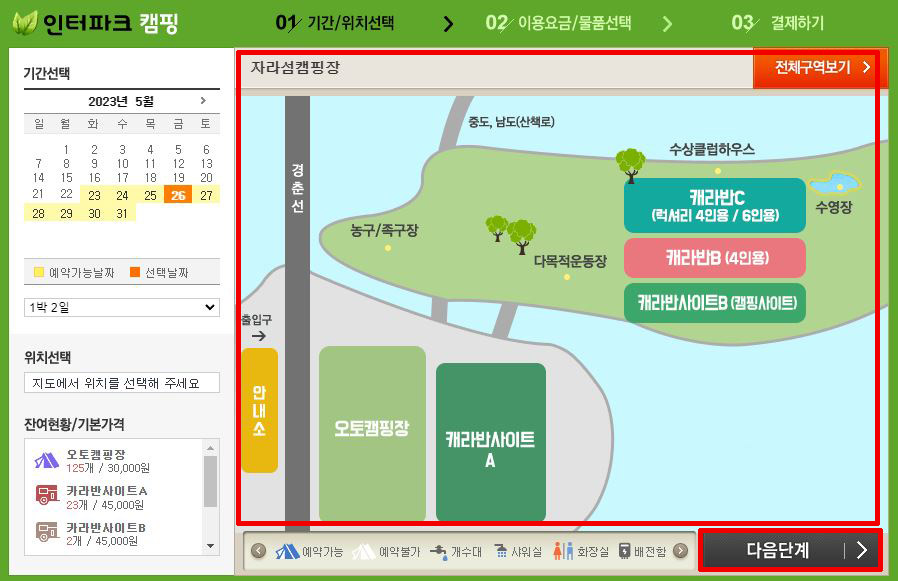 ③ 자라섬 캠핑장 지도에서 원하시는 구역 선택 → 다음단계 이동