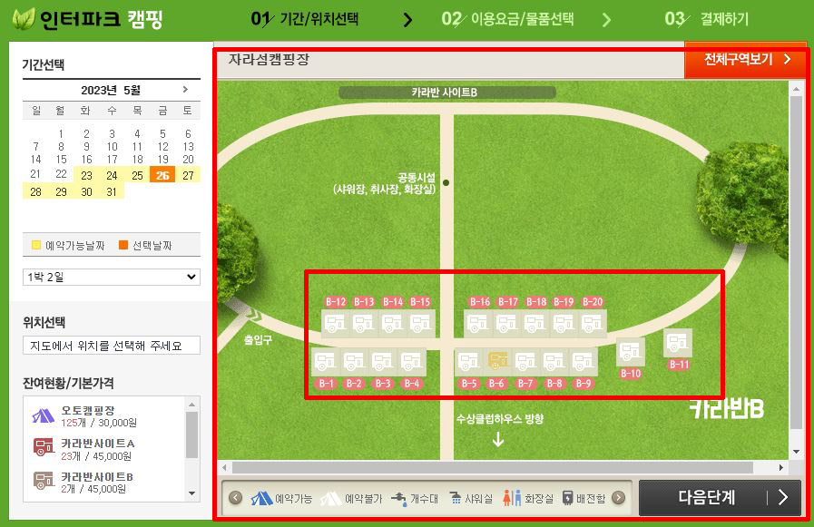 ③ 자라섬 캠핑장 지도에서 원하시는 구역 선택 → 다음단계 이동