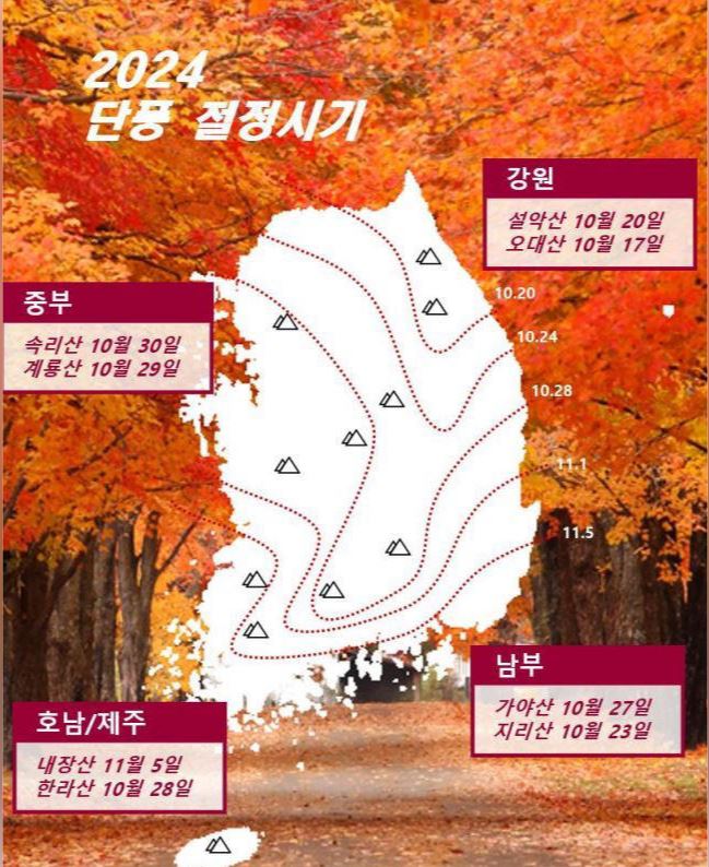 각 지역의 단풍 시기를 미리 확인한 후 계획하세요. 중부지방은 10월 28일부터 28~30일 절정이며, 설악산은 10월 20일입니다.